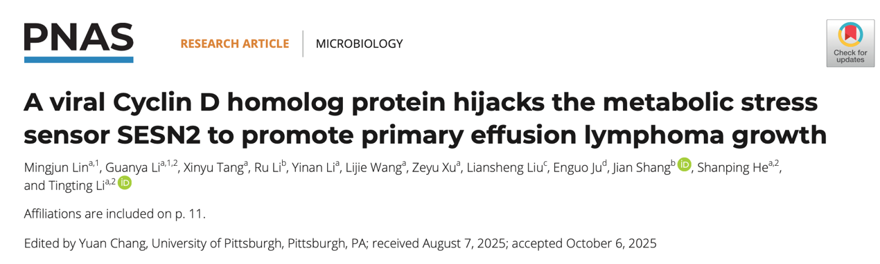 2025年11月06日,湖南师范大学生命科学学院李婷婷、何善平团队在国际权威期刊《美国科学院院刊》(Proceedings of the National Academy of Sciences of the USA, PNAS)发表的最新研究成果揭示,卡波氏肉瘤病毒(KSHV)通过编码Cyclin D2同源蛋白(vCyclin),劫持宿主代谢应激传感器Sestrin2(SESN2),从而促进病毒相关恶性淋巴瘤生长。这一发现为病毒相关肿瘤的代谢调控机制提供了分子依据,并指出了潜在的治疗靶点。