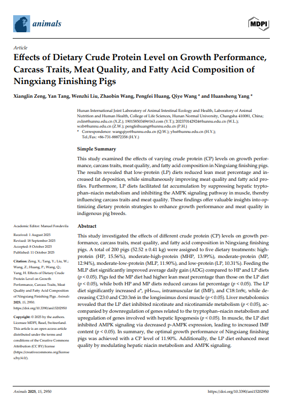 上一条:杨焕胜王启业老师课题组2025 Diammonium phosphate supplementation in low-protein diets enhances growth performance in growing pigs without compromising carcass traits and meat quality 下一条:杨焕胜王启业老师课题组2025 APOBEC1-Dependent RNA Eiting of TNF Signaling Orchestrates Ileal Villus Morphogenesis in Pigs: Integrative Transcriptomic and Editomic Insights